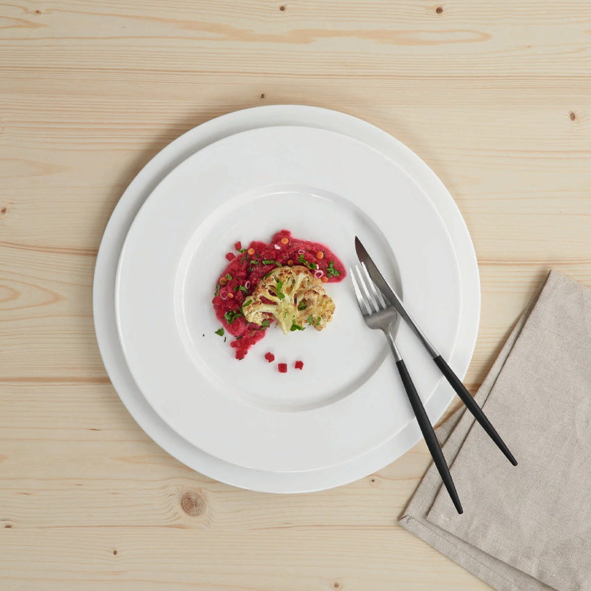 Complementing every table, the À Table collection presents a durable composition, and white allure with a pure, elegant design. This beautiful plate with a rim is ideal for serving your delicious homemade meals. The rim allows you to contain the sauces, and its sleek appearance is perfect for everyday or special occasions.