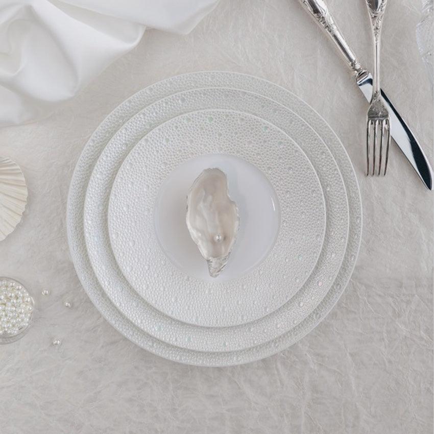 The Bernardaud Ecume dinnerware plate adds an elegant touch to any dinner occasion. Subtle effects within the material, masterful glazing work, and the hollow engraving of Ecume makes for a contemporary and poetic collection that produces a highly elegant and modern table setting.