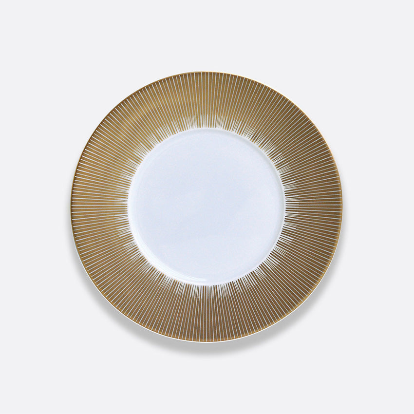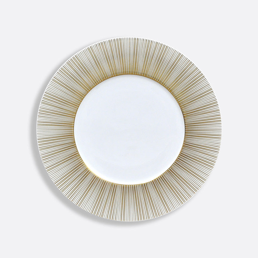 Since 1863 in Limoges, France, Bernardaud has made a statement with high-quality porcelain creations. The Sol Collection offers a contemporary design, inspired by the beautiful sun rays and its yellow gold detailing. This plate will bring a sophisticated and unique aesthetic to your table setting for your next hosting party!
