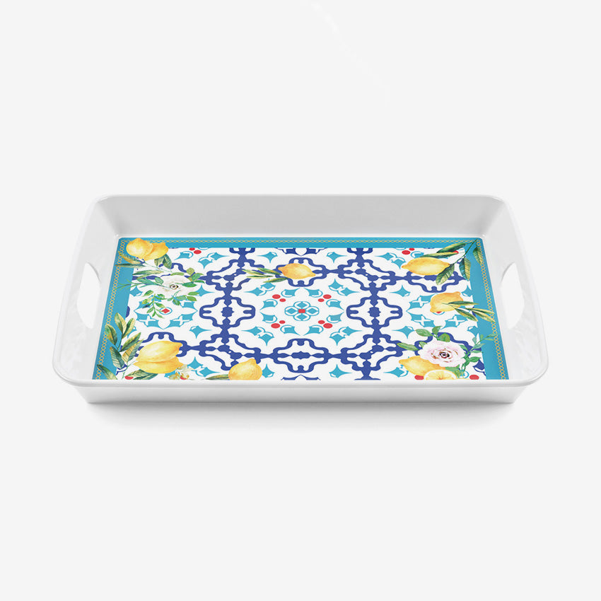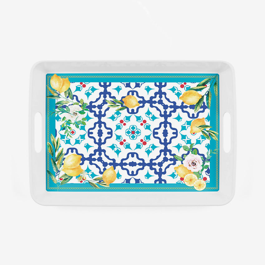 The Flower & Lemon collection captures the essence of spring flowers and lemon blossoms with its lively colours. A versatile addition to any table, this rectangular tray with handles is ideal for outdoor gatherings, casual brunches, and formal celebrations. Made of durable BPA-free melamine, it is both low-maintenance and adds a pop of colour to your table setting.