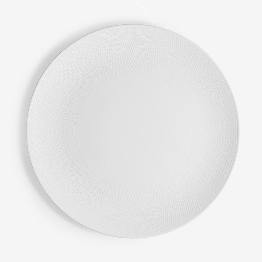 Elevate your dining experience with the Gio Serving Platter from Wedgwood. Crafted from fine bone china, it offers a smooth white translucency and exceptional durability. Its subtly embossed textured border enhances your table setting without overpowering it, making it perfect for showcasing tapas or Asian-inspired dishes.
