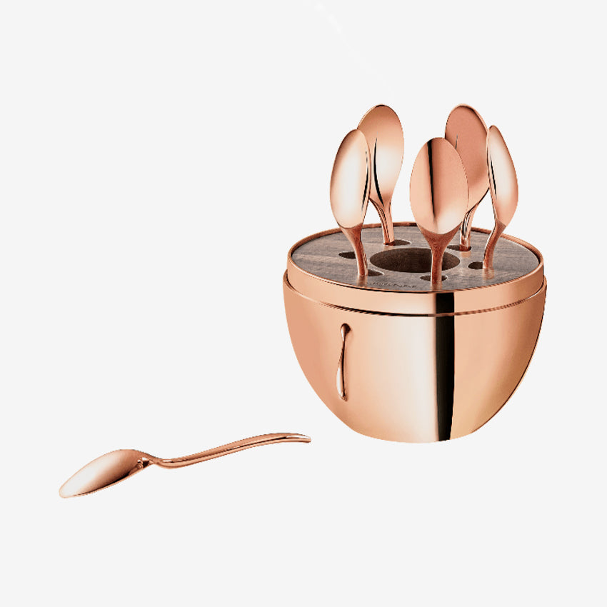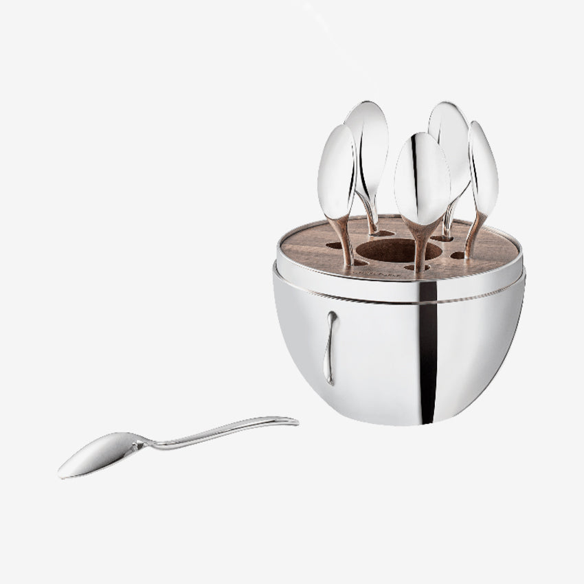 This set of 6 espresso spoons by Christofle is made with silver-plating and comes with a walnut wood interior disk for storage. With MOOD, Christofle brings a two-century long tradition into the modern day with a luxurious twist. These spoons can act as everyday items or serve as conversation pieces in any living space.