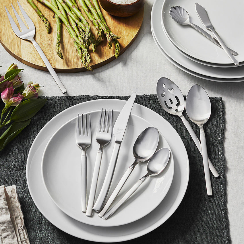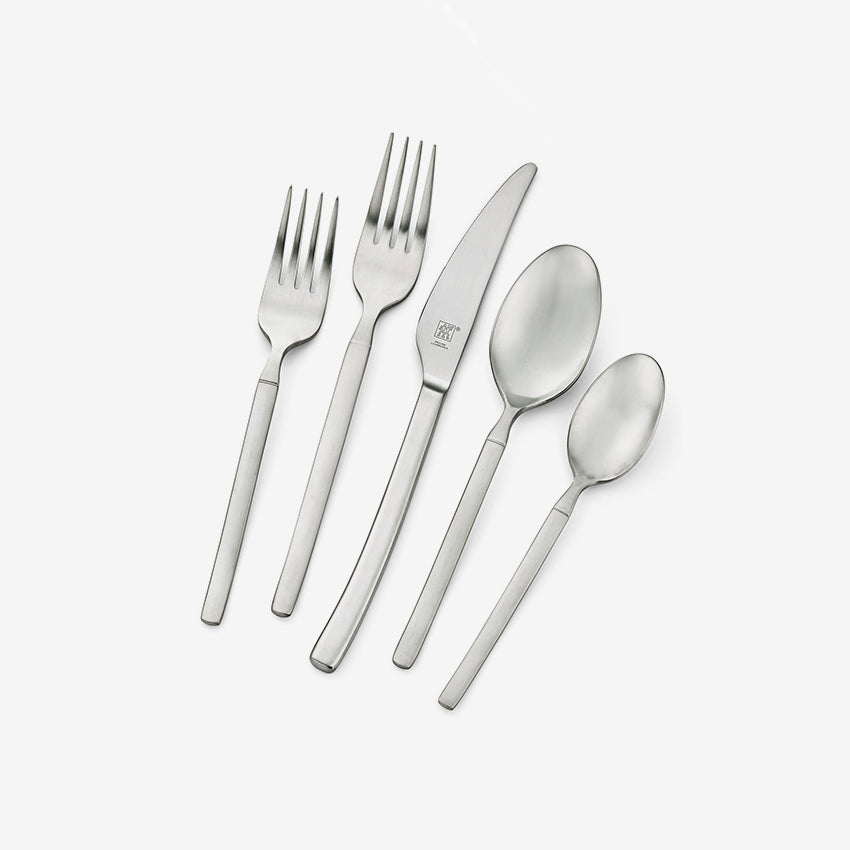 The Zwilling's Twin Opus flatware is a 45-piece ensemble that combines sleek, modern aesthetics with the refined craftsmanship Zwilling has perfected over nearly three centuries. Each piece features a gracefully curved handle and polished mirror finish that catches the light beautifully. Made from premium 18/10 stainless steel, the collection resists tarnishing while maintaining its silvery brilliance through countless meals and gatherings.