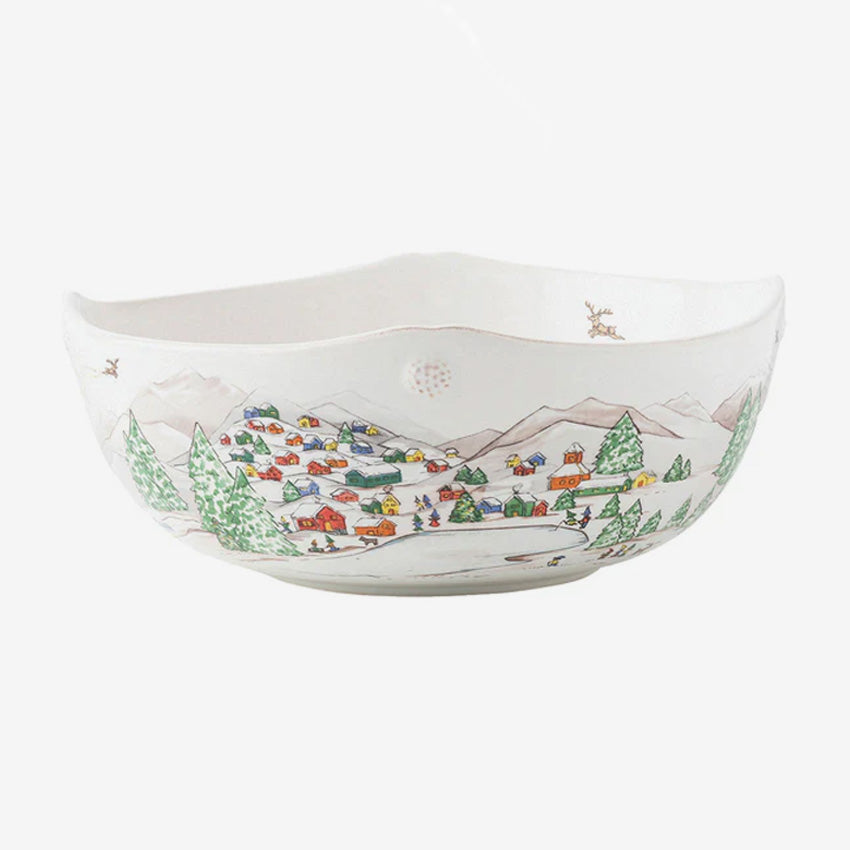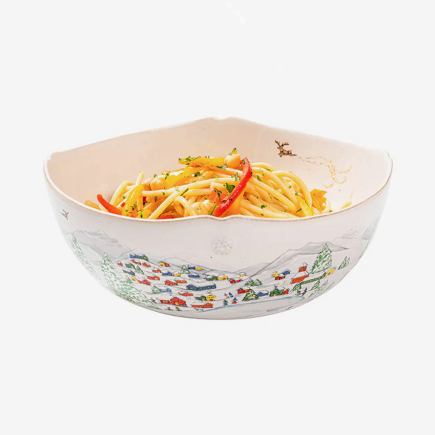This serving bowl, from the Berry & Thread collection, incorporates classic patterns often seen in Bohemian glassware. In preparation for the holidays, the North Pole series is adorned with hand-illustrated pieces with the signature Berry & Thread embellishments along the border. The collection includes charming designs of creating and imagining a downtown North Pole such as the reindeer barn and Santa's cottage, creating a festive and playful atmosphere around the table for the holiday season.