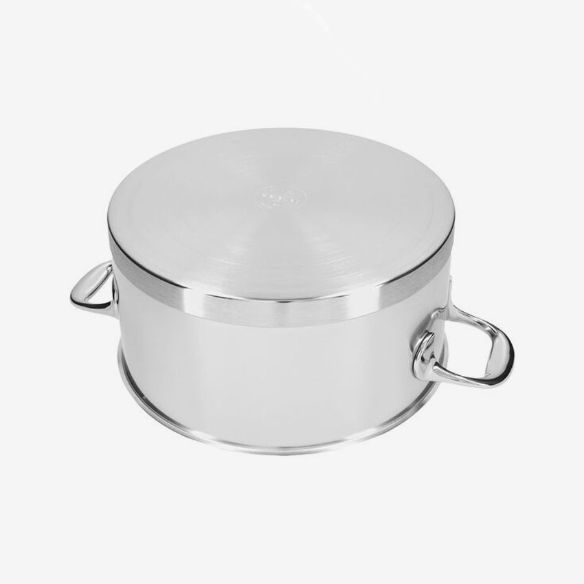 This Demeyere Atlantis 7 Stew Pot with Lid is a reliable kitchen essential for perfectly cooked roasts, fried dishes, and steamed meats. Its high-quality stainless steel construction includes an InductoSeal base technology, which combines stainless steel and aluminium for efficient heat distribution. The cast stainless steel handle remains cool during cooking, allowing you to prepare meals without constantly monitoring. Additionally, the Silvinox surface ensures easy maintenance—fingerprints are easily wiped off and the stainless steel retains its shine. This durable casserole will help you craft delicious dishes quickly and effortlessly.