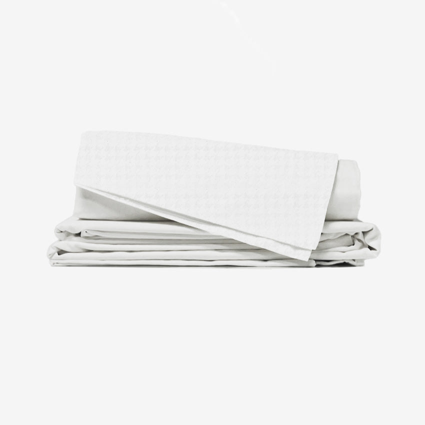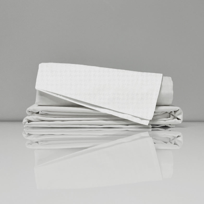 The Sera Fina by Maison Lipari, Lago Como Houndstooth Duvet Cover Set is crafted from jacquard cotton with percale cotton, known for its fresh and textured feeling of the absolute best quality. This cotton is a strong and resistant choice for everyday sheets, perfect for a luxury master bedroom with a more design-forward alternative to plain white sheet cover sets. With a houndstooth pattern and textured feeling, it leaves a fresh and breathable material that is ideal for those who run warm, looking for cooling sheets.