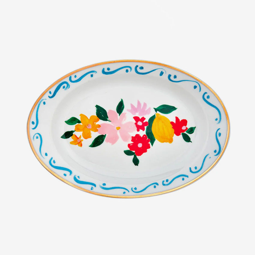 Add some love to your table with Bitossi Home's Con Amore Oval Tray - Fiori E Limoni. Featuring the playful pen work of Italian-British artist Chiara Perano, this plate's mix of floral illustrations with a cute lemon will bring a fun vibe and colour to any gathering. Use it for serving small snacks or just display it to spread positive vibes.