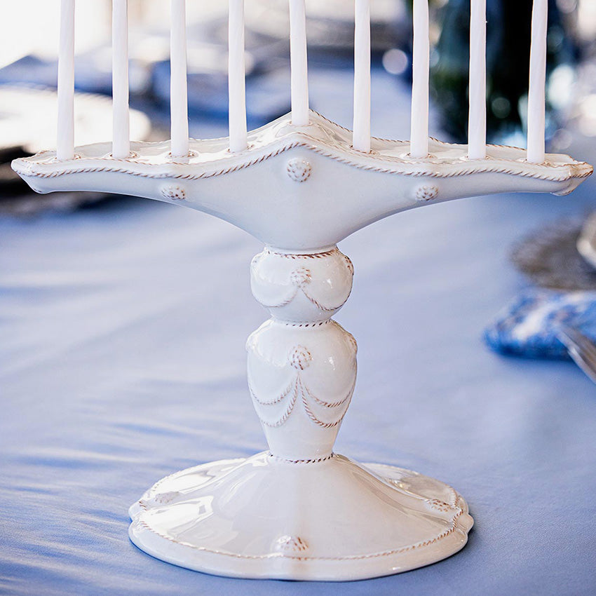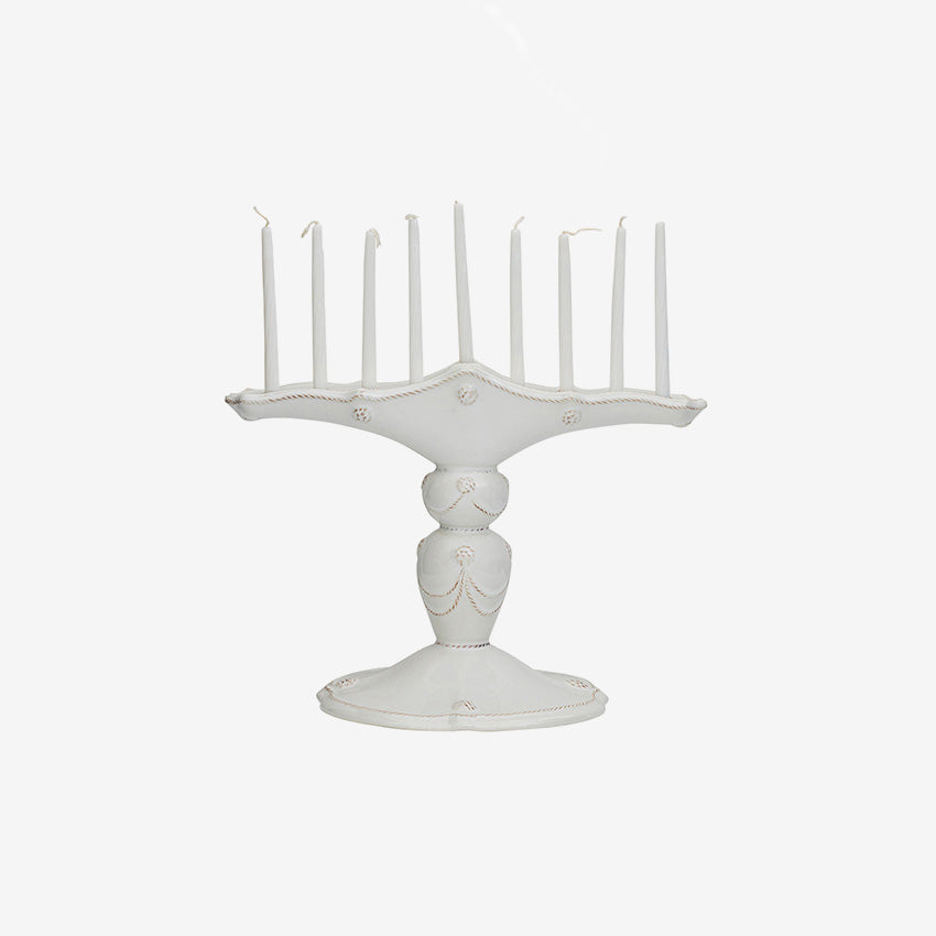 Celebrate the Festival of Lights with this elegant menorah in our iconic Berry & Thread pattern. Featuring a beautifully sculpted pedestal embellished with subtle detailing and scalloped flourishes, you may just want to keep this pretty piece on your mantel year-round.