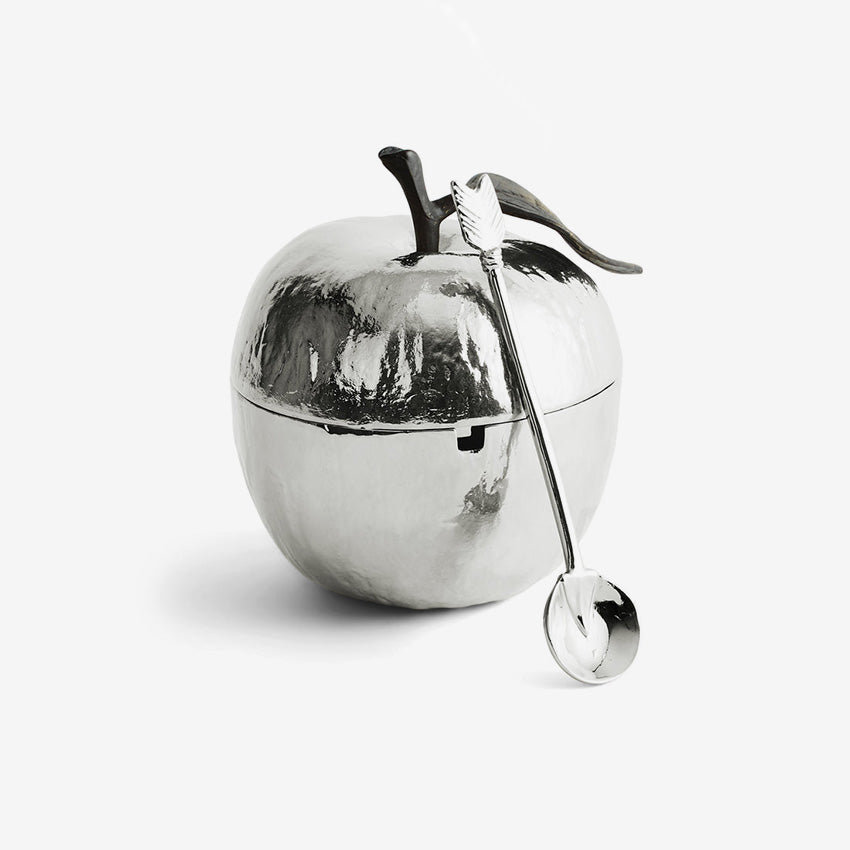 This Michael Aram Apple Honey Pot with Spoon serves as a beautiful sculpture that can be used to decorate a space or gifted to a friend. Not only is it stunning, it also possesses a practical purpose, making it even more valuable. Michael Aram's designs find inspiration in the form of fruits and the symbolic associations they hold: love, fertility, and temptation. His apple-shaped Honey Pot with Spoon is particularly eye-catching; the arrow-shaped spoon is a subtle homage to the William Tell legend. This ornate object is perfect for showcasing in the kitchen and sparking conversations about its beauty.