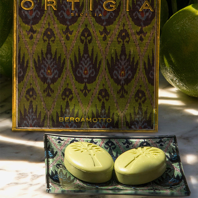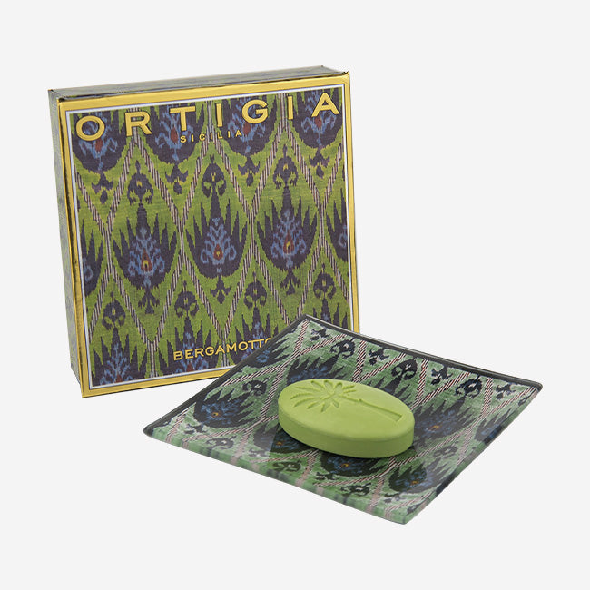 Crafted in Italy, this Bergamotto Olive Oil Soap Glass Plate features magnificent serigraphic printing on the packaging and is handmade by skilled artisans. Perfect to gift loved ones, leaving a soft and hydrated feeling to your skin with a beautiful scent.