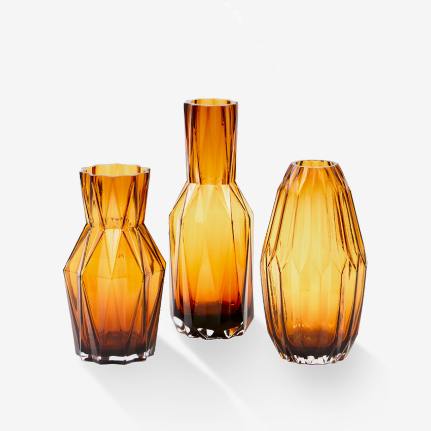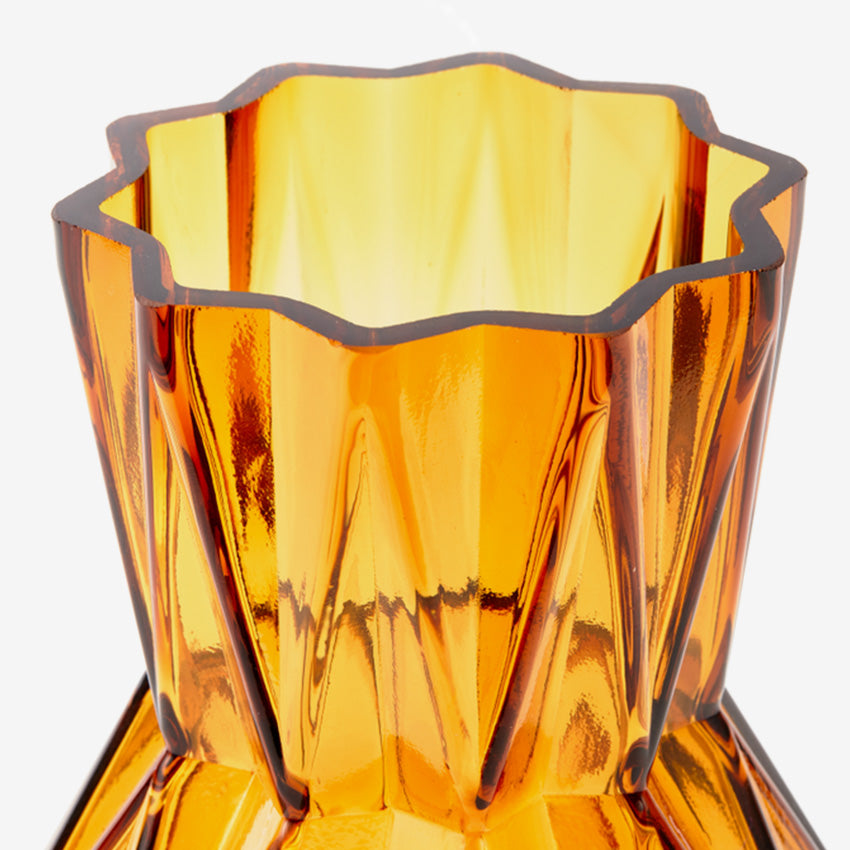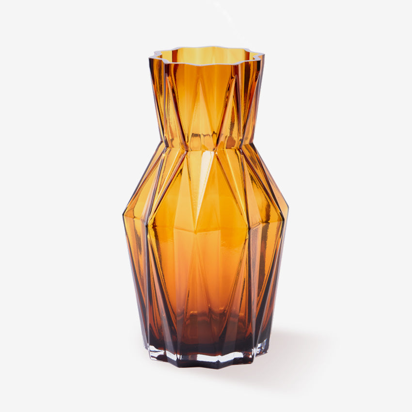 Meet the Glass Folds Vase in ochre where architectural design meets timeless elegance. Its geometric folded form captures light beautifully, creating an interplay of shadows and brilliance. The rich ochre tone bridges past and present, offering a color that feels both nostalgic and utterly current.