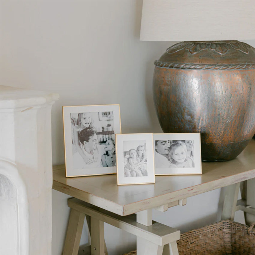 This refined photo frame features a sleek matte gold border paired with a soft cream passe-partout, enhancing any image beautifully. Designed for versatility, it can be displayed in either portrait or landscape orientation to suit your space perfectly.