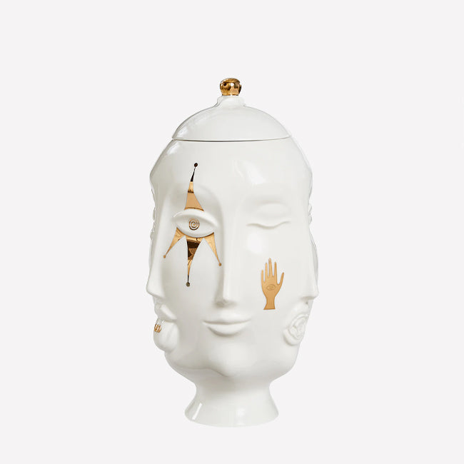 Decorated with a distinctive glazed finish and gold designs on its white porcelain body, this Muse piece showcases the collection's signature mix of modern and classic design elements. The bold style doubles as a functional work of art: complementing your existing collection or making a statement on a bookshelf, pedestal or tabletop.