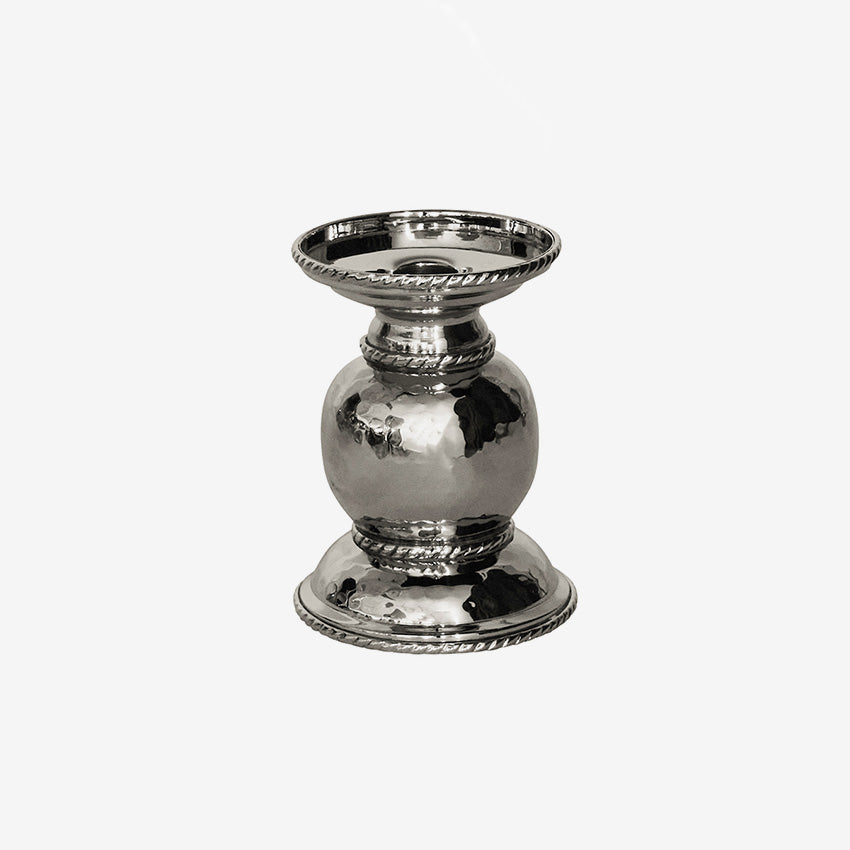 Elevate any setting with the warm glow of candlelight using this stunning candle holder. Expertly handcrafted from hammered stainless steel, it features a distinctive thread motif and a radiant polished finish. Perfectly versatile, it accommodates both taper and pillar candles, making it an elegant addition for daily use or special celebrations.