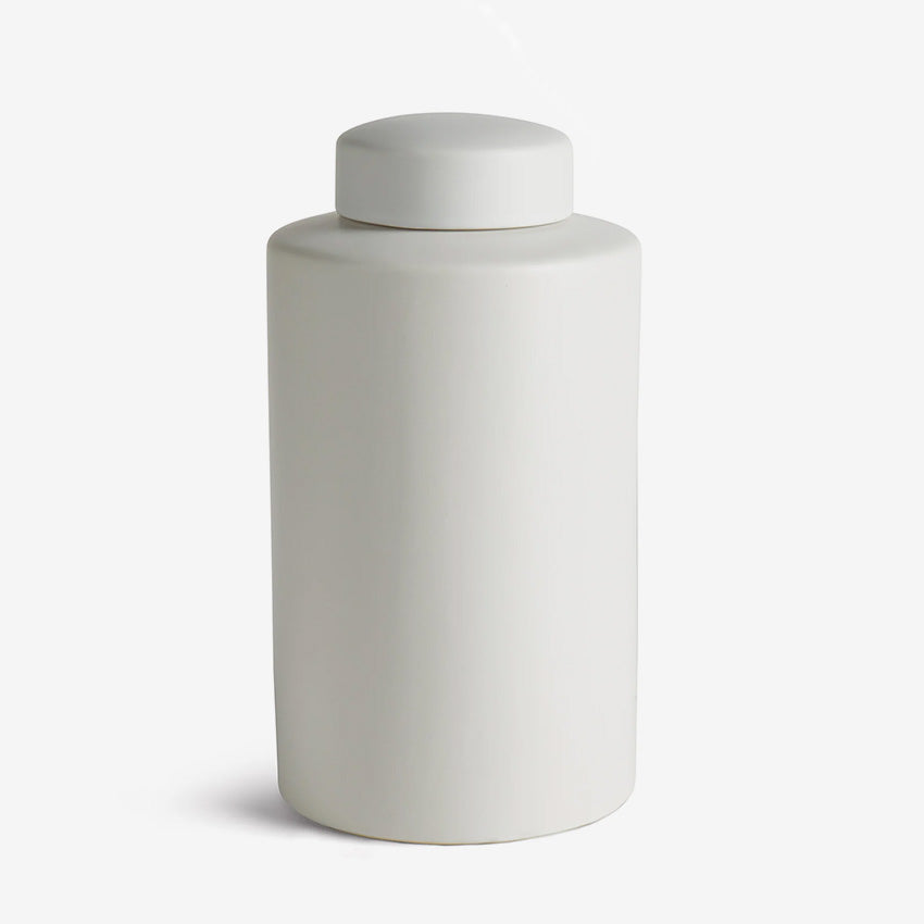 The Westcliff Cylinder Jar by Barclay Butera offers a contemporary take on the classic ginger jar, distinguished by its elegant matte finish. Its sleek, cylindrical design allows it to complement a variety of decor styles effortlessly. Each jar is handcrafted by expert artisans, making every piece unique with slight variations in size and colour.