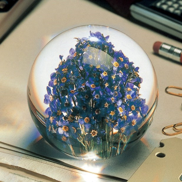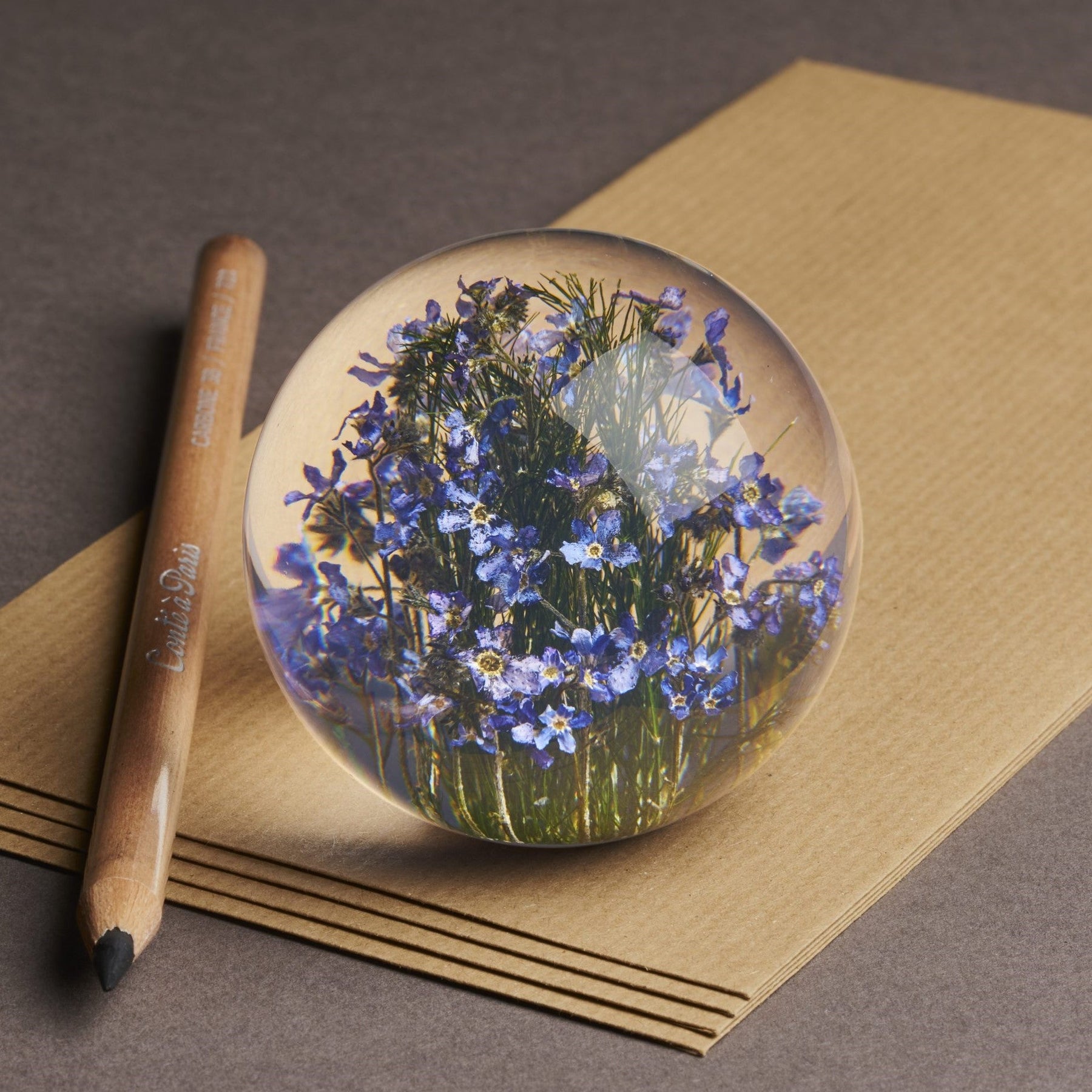 Ce presse-papier Hafod Grange en forme de myosotis ( Myosotis sylvatica) est un trésor artisanal du sud du Pays de Galles. Une véritable fleur de myosotis est suspendue dans une sphère en résine polyester transparente, tandis qu'un filtre UV intégré la protège de la décoloration. Chaque pièce est fabriquée individuellement, transformant une fleur authentique en un souvenir précieux et durable.
