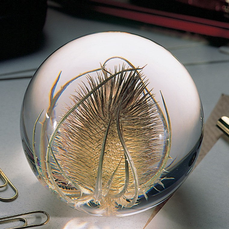 Ce presse-papier en forme de cardère de Hafod Grange est un trésor artisanal du sud du Pays de Galles. Une véritable cardère est suspendue dans une sphère en résine polyester transparente, tandis qu'un filtre UV intégré protège la fleur de la décoloration. Chaque pièce est fabriquée individuellement, transformant une fleur authentique en un souvenir précieux et durable.