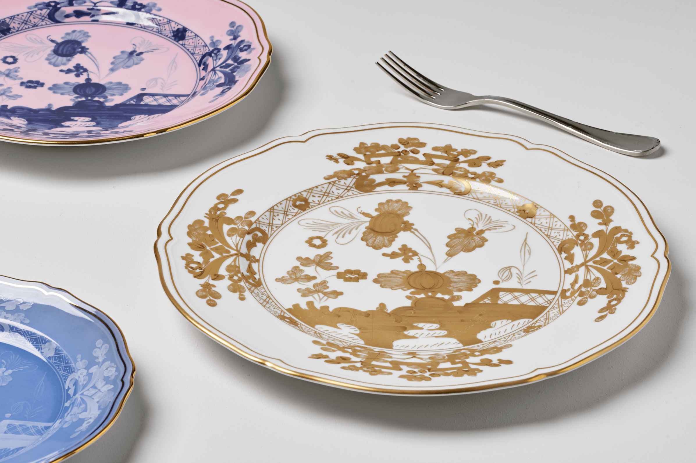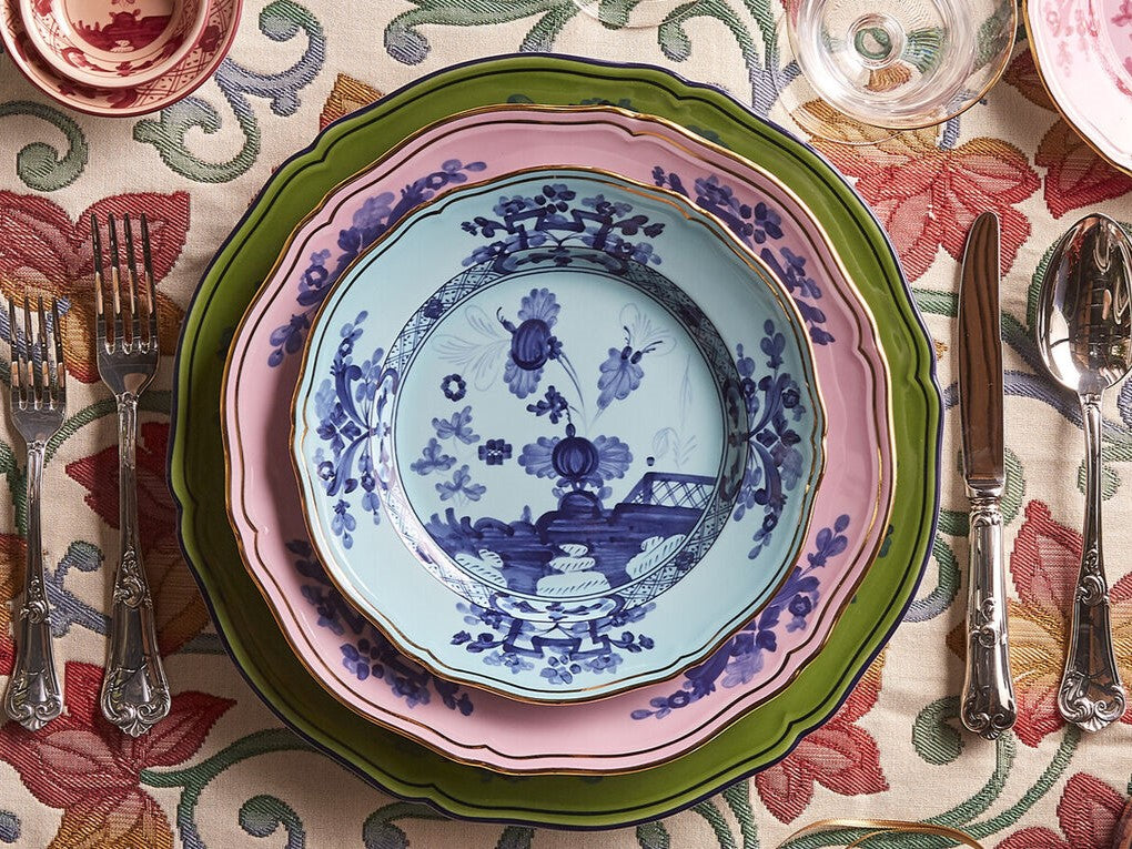 Designed by Alessandro Michele, the OrienteItaliano collection combines 2 Italian artistic elements, the Antico Docciashapeand the floral Garofano motif. Inspired by oriental gardens, the colorful porcelain pieces bring a distinctivestyle to your table setting.